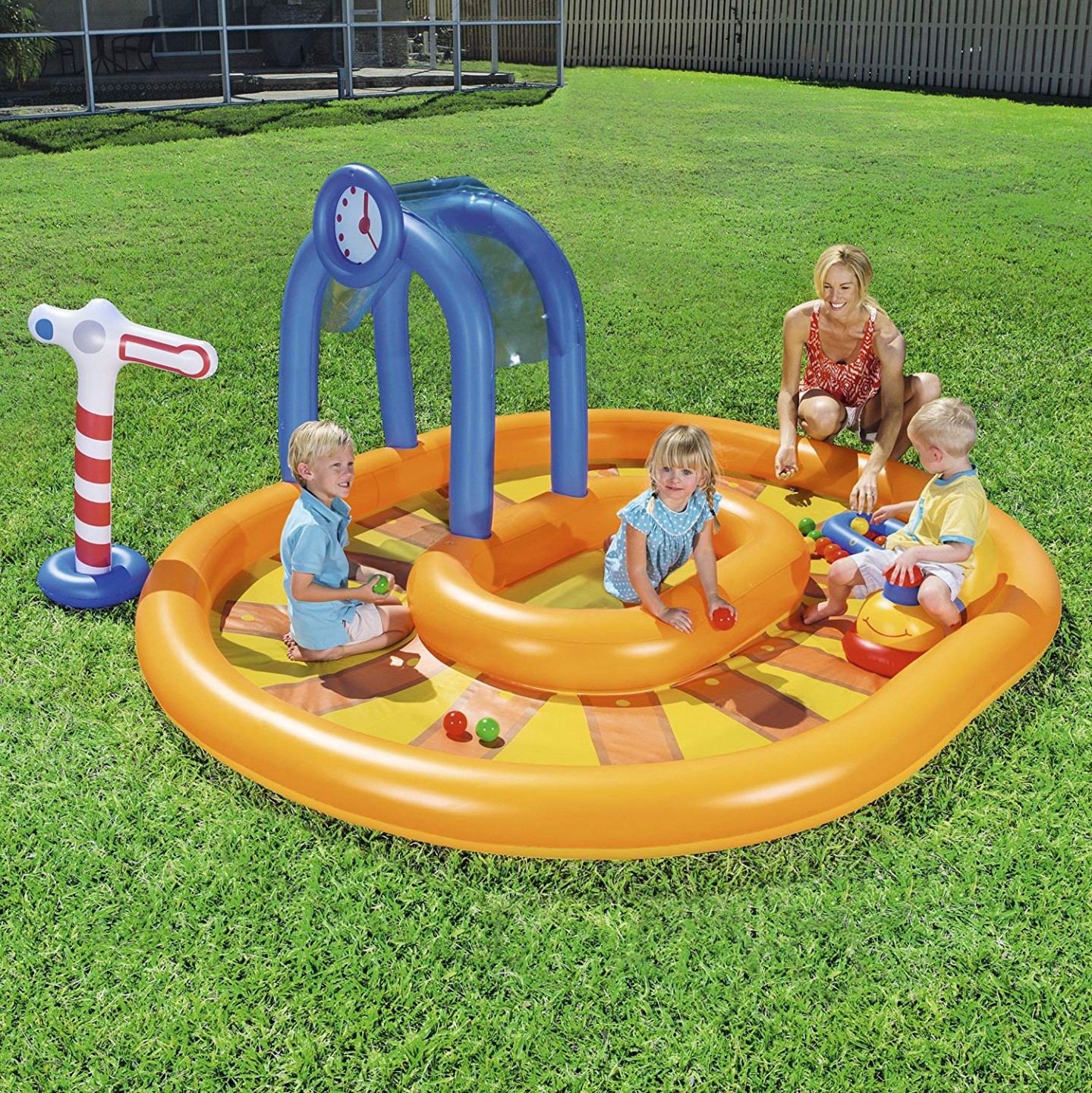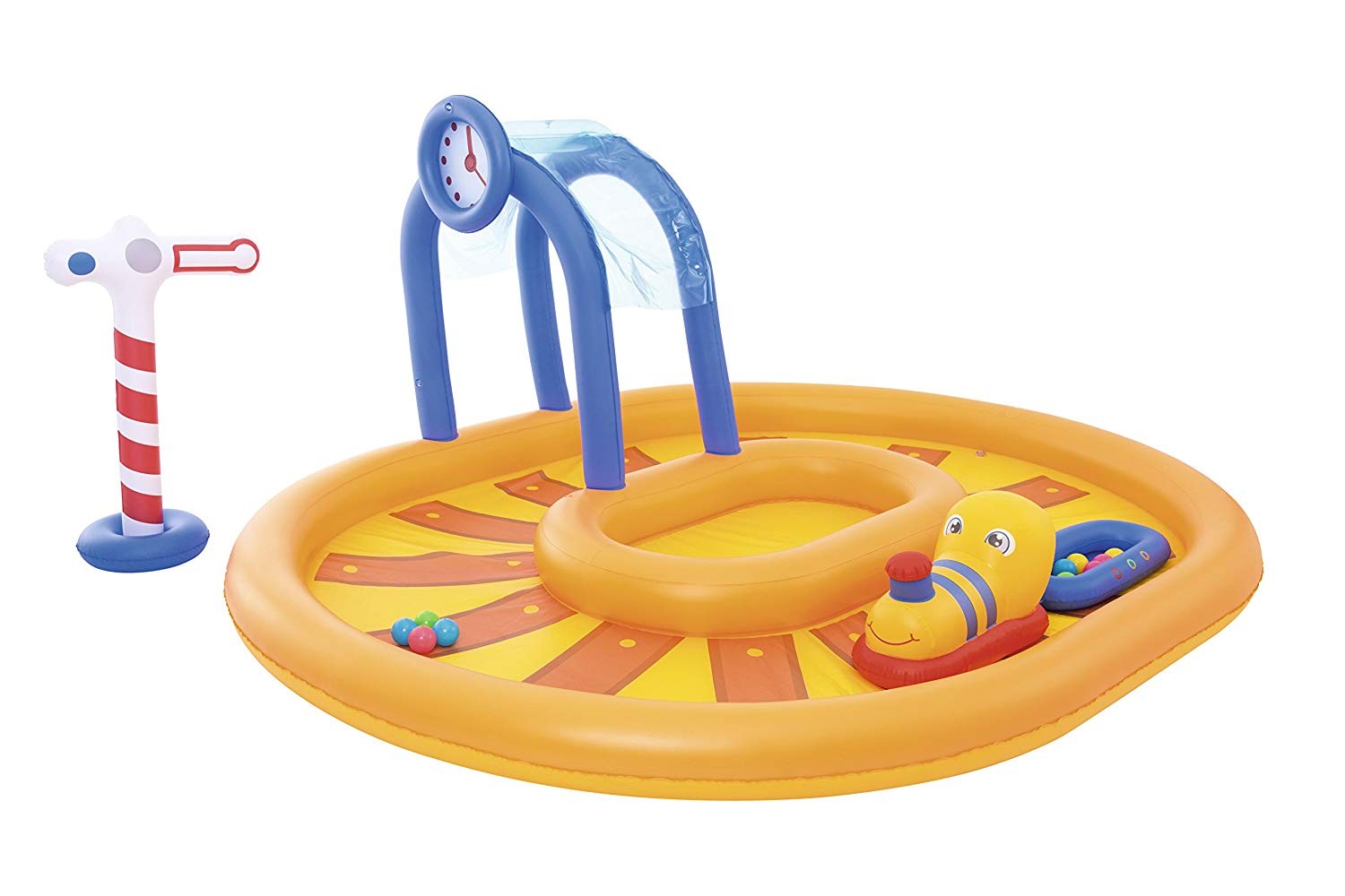 Nafukovací bazénové centrum je vyrobeno z vinylového materiálu o síle 0,27/22 mm. Bazén je vhodný pro děti od 2 let. Obsah balení: vláček s vagonkem Semafor 10 míčků. Do nádraží lze připojit vodovodní hadici pro obzvláště horké letní dny. Vodní kapacita bazénu je 367 litrů. Bazén má ve dně vypouštěcí ventil. Tento bazén nemá po straně vývody pro filtraci a nelze k němu objednat žádné příslušenství. Je to bazének pro děti, u kterého je ekonomičtější výměna vody nežli její filtrace.