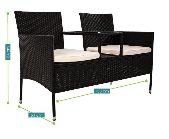 Polyratanová lavice láká k pohodlnému posezení na zahradě, terase či na balkóně nebo v zimní zahradě. Umělý ratan v sobě snoubí krásný vzhled, příznačný pro svůj přírodní protějšek, se snadnou údržbou a odolností proti povětrnostním vlivům. Jedinečnou vychytávkou této lavice je potom stolek mezi sedadly, na který můžete odložit občerstvení, knížku nebo časopis. Praktická skleněná deska poskytuje stolku ochranu proti slunečnímu záření. Měkké podsedáky jsou odnímatelné a lze je snadno vyčistit.